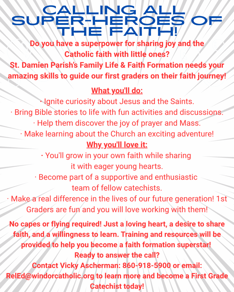 While our Parish is blessed to have volunteers who return each year as Catechists, new volunteers are usually needed. Prior teaching experience is helpful but not required. You do need to be a practicing Catholic with a commitment to sharing your faith with our Parish youth and teaching them the fundamentals of our faith.